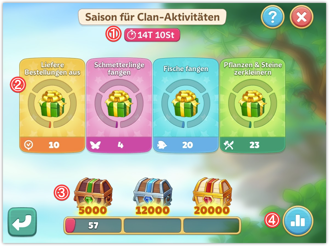 Die Belohnungen für Clan-Aktivitäten enthalten verschiedene nützliche Gegenstände und spezielle Clan-Münzen. Du kannst diese Münzen im Shop auf deiner Heimatinsel im Tab Clan ausgeben.