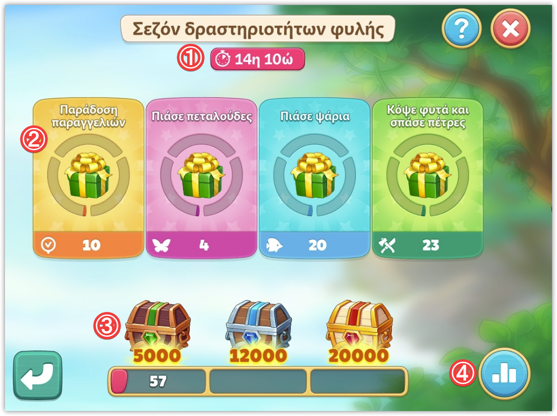 - Την πρόοδο και τις ανταμοιβές. Οι πόντοι που κερδίζεις όταν ολοκληρώνεις αποστολές προστίθενται, γεμίζοντας την μπάρα προόδου. Όσο περισσότερους πόντους συλλέγει η φυλή σου, τόσο καλύτερες θα είναι οι ανταμοιβές για όλα τα μέλη. Πάτησε παρατεταμένα ένα εικονίδιο ανταμοιβής για να δεις τι κρύβει. Σε αντίθεση με τις ανταμοιβές αποστολής, οι ανταμοιβές της σεζόν πιστώνονται στο τέλος της σεζόν.