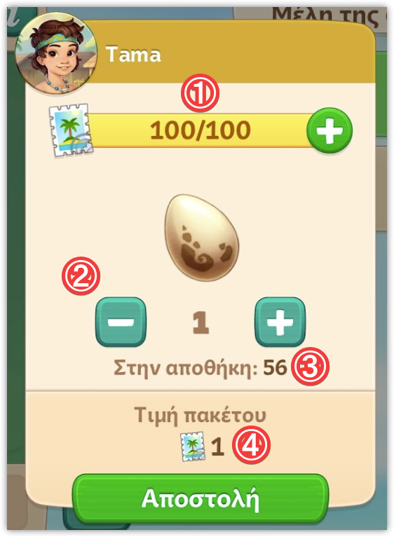 - Την ποσότητα του αντικειμένου που πρόκειται να στείλεις - μπορείς να την προσαρμόσεις χρησιμοποιώντας τα κουμπιά + και –.