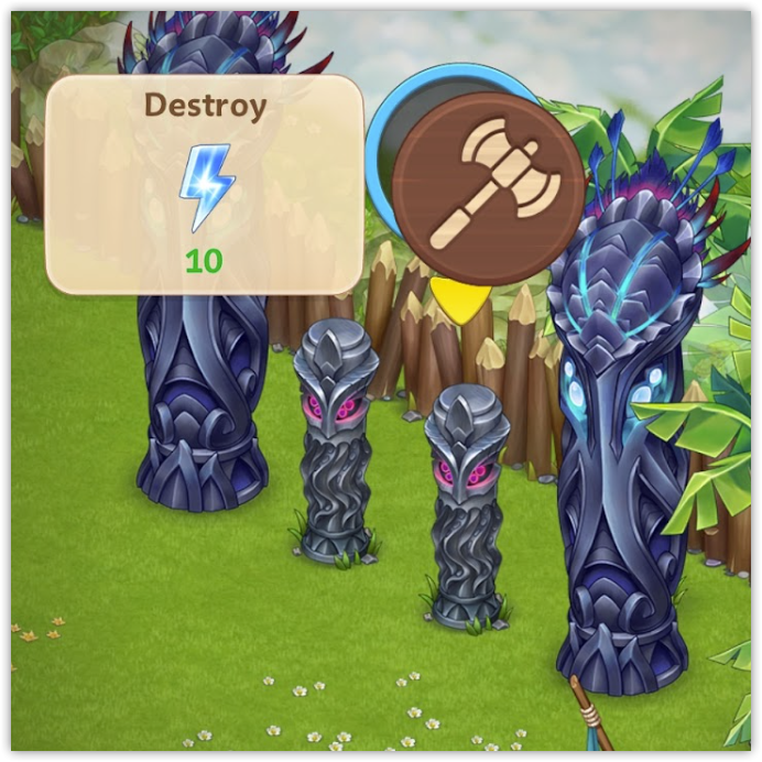 Once the defenders are defeated, the totems can be destroyed using either 10 or 25 energy, depending on their size.