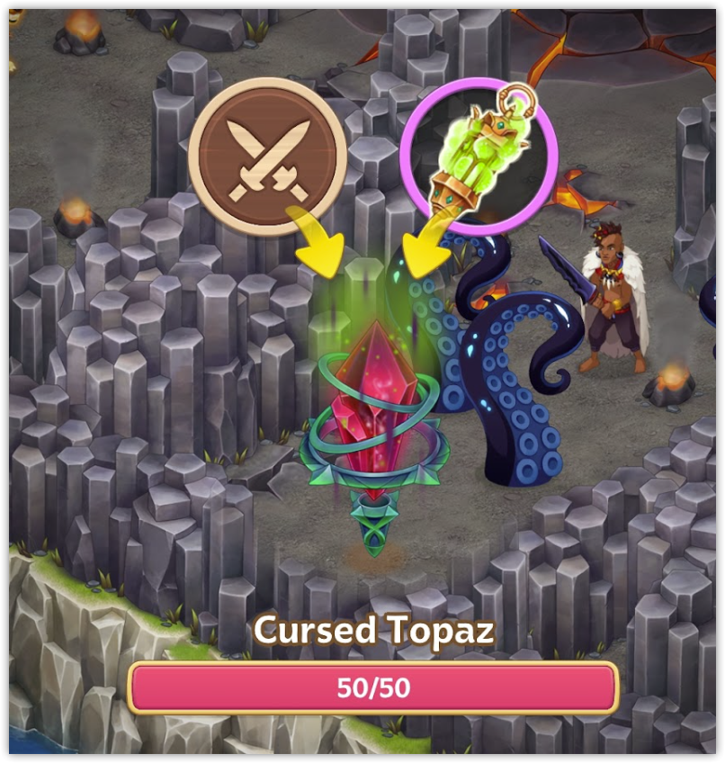 Turns out, Brok’zul has cursed the Ahi warriors, binding them under the power of dark totems. To free them, we must destroy the totems. But beware – the totems are guarded by tentacles and fire hounds.
