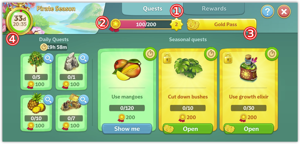 - Seasonal Quests: harder quests that give more points. You have 10 hours to complete them. A new quest will appear 3 days after the previous quest in that slot ends. By default, you have 1 seasonal quest at a time, but with a Gold Pass, you have 3.