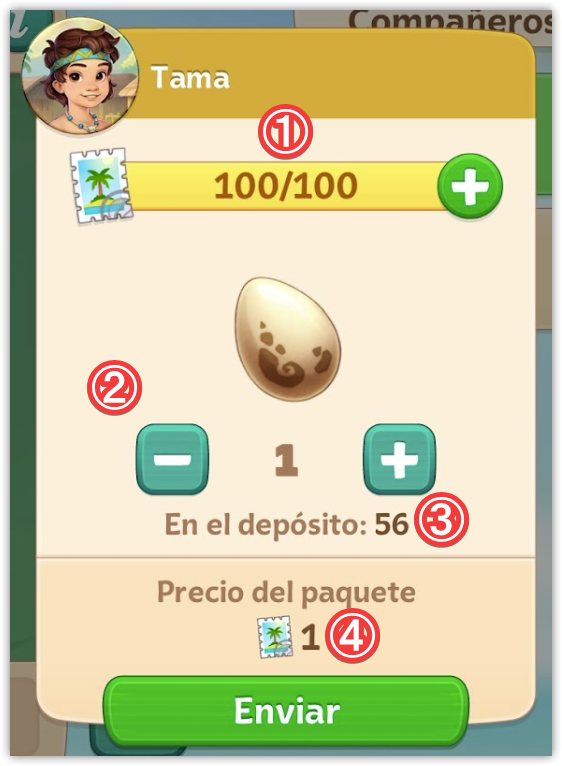 - El costo del envío en estampillas. Si el costo es mayor que el número de estampillas que tienes, podrás comprar las estampillas que te faltan con diamantes después de presionar Enviar.