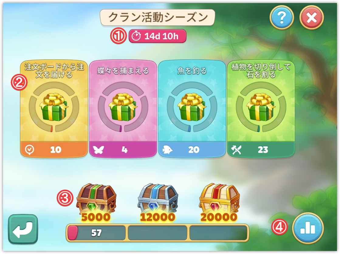 - 進行状況と報酬。 完了したクエストで獲得したポイントが加算され、進行状況バーが伸びていきます。 クランが集めるポイントが多いほど、すべてのメンバーが受け取る報酬が良くなります。 報酬アイコンを長押しすると、中身を見ることができます。 クエスト報酬とは異なり、シーズン報酬はシーズンの終了時に付与されます。