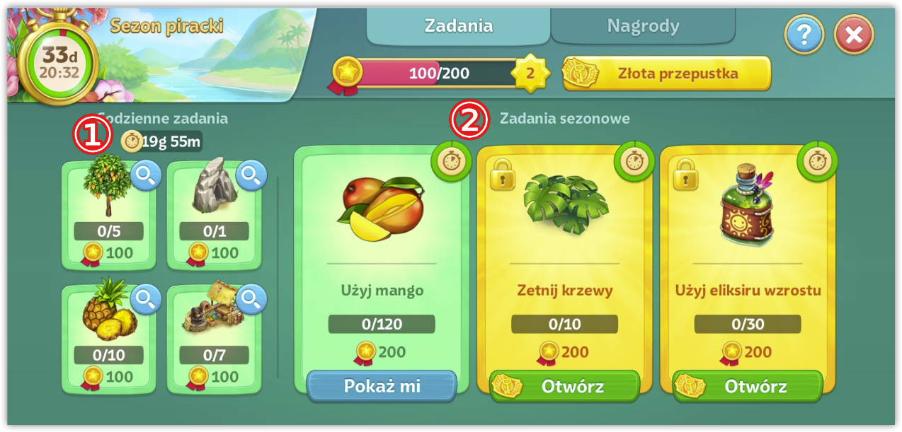 - Karta „Zadania” oraz karta „Nagrody”. Naciśnij je, aby przełączać między nimi. Więcej szczegółów znajduje się poniżej!