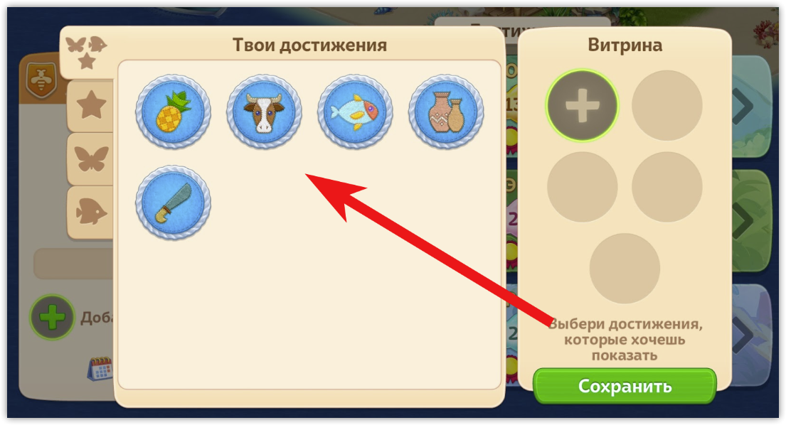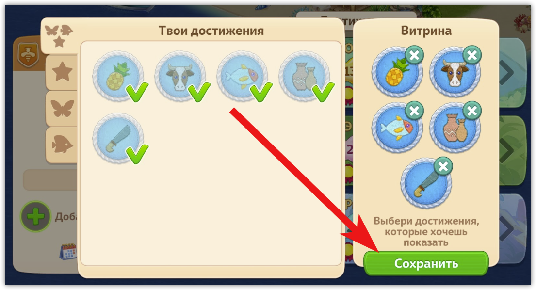 Готово! Теперь выбранные достижения будут видны другим островитянам.